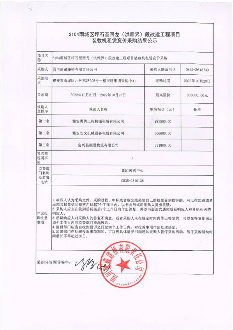 四川康藏路橋有限責(zé)任公司S104雨城區(qū)坪石至回龍(洪雅界)段改建工程項(xiàng)目裝載機(jī)租賃競價采購結(jié)果公示