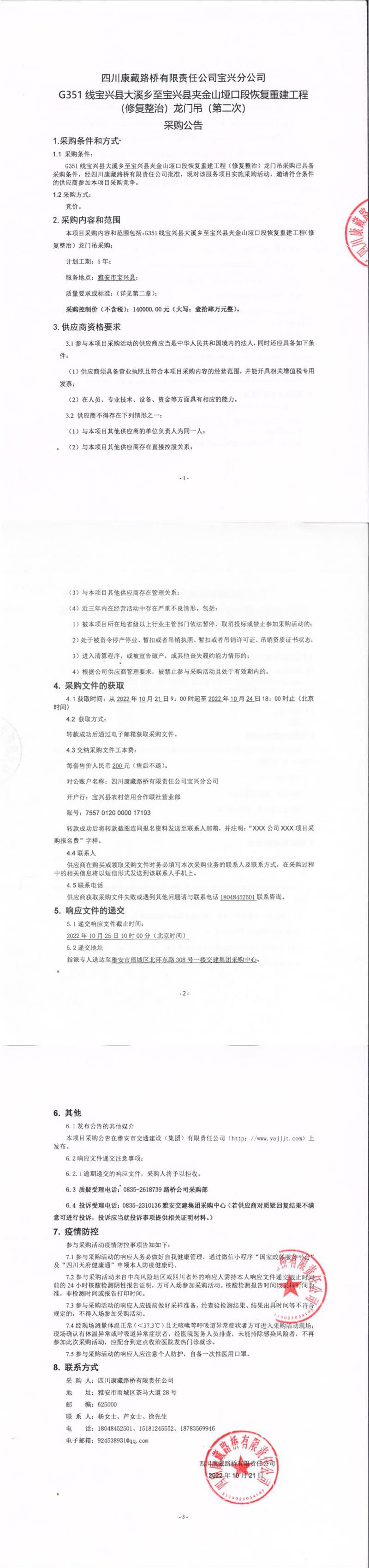 四川康藏路橋有限責任公司寶興分公司G351線寶興縣大溪鄉(xiāng)至寶興縣夾金山埡口段恢復重建工程(修復整治)龍門吊(第二次)采購公告