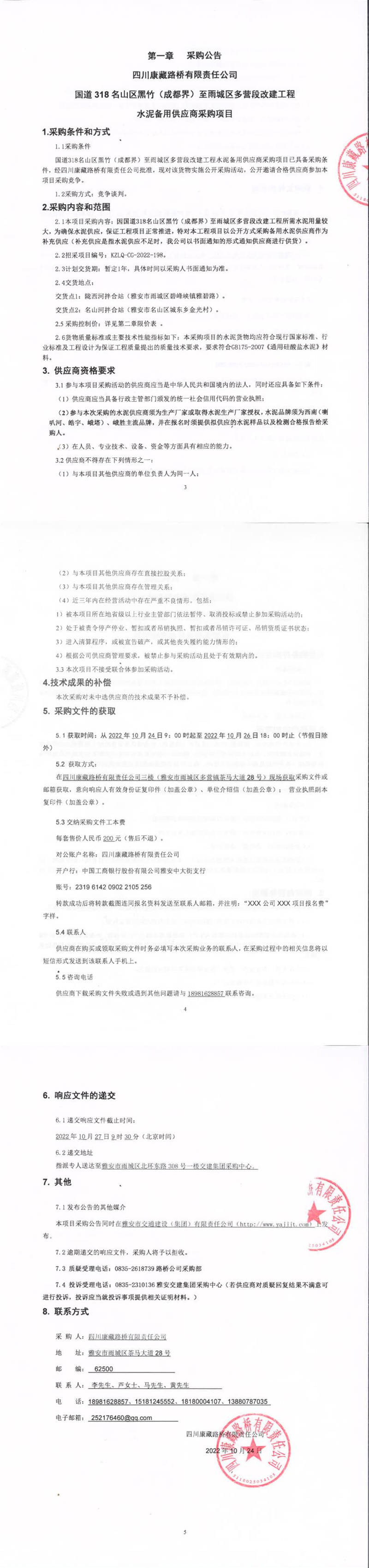 四川康藏路橋有限責(zé)任公司國(guó)道318名山區(qū)黑竹(成都界)至雨城區(qū)多營(yíng)段改建工程水泥備用供應(yīng)商采購(gòu)項(xiàng)目補(bǔ)遺書(一)