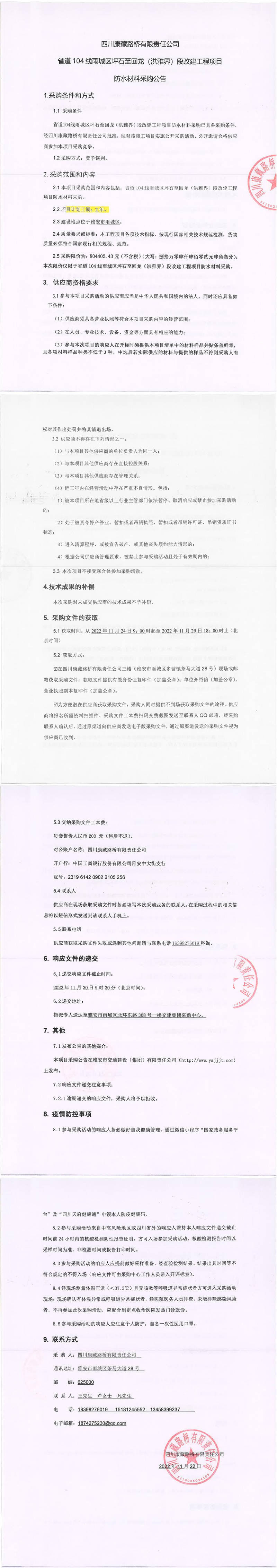 四川康藏路橋有限責任公司省道104雨城區(qū)坪石至回龍(洪雅界)段改建工程項目防水材料采購公告