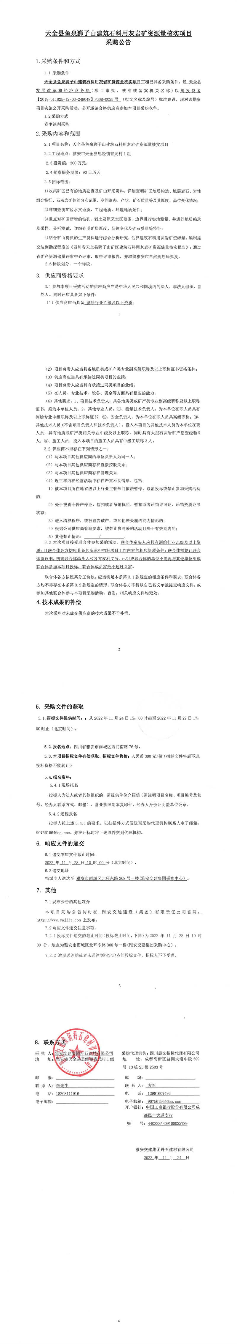 雅安交建集團(tuán)丹石建材有限公司天全縣魚泉獅子山建筑石料用灰?guī)r礦資源量核實(shí)項(xiàng)目采購公告