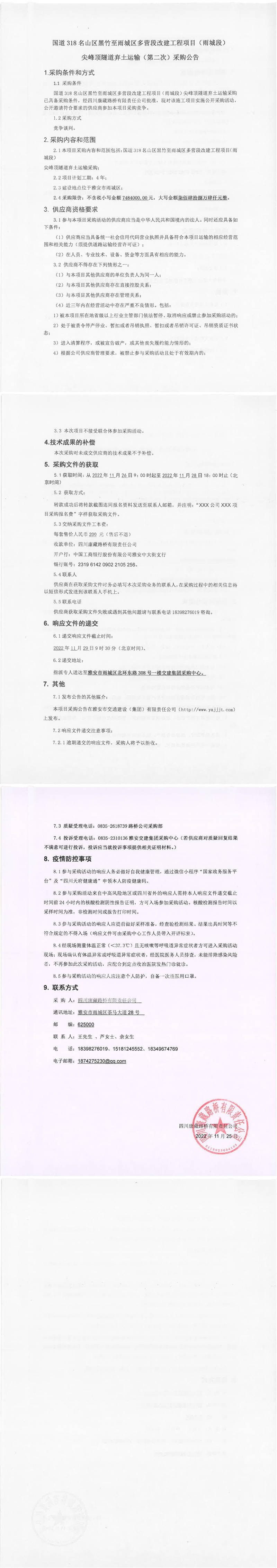 四川康藏路橋有限責(zé)任公司國道318名山區(qū)黑竹至雨城區(qū)多營段改建工程項目(雨城段)尖峰頂隧道棄土運輸(第二次)采購公告