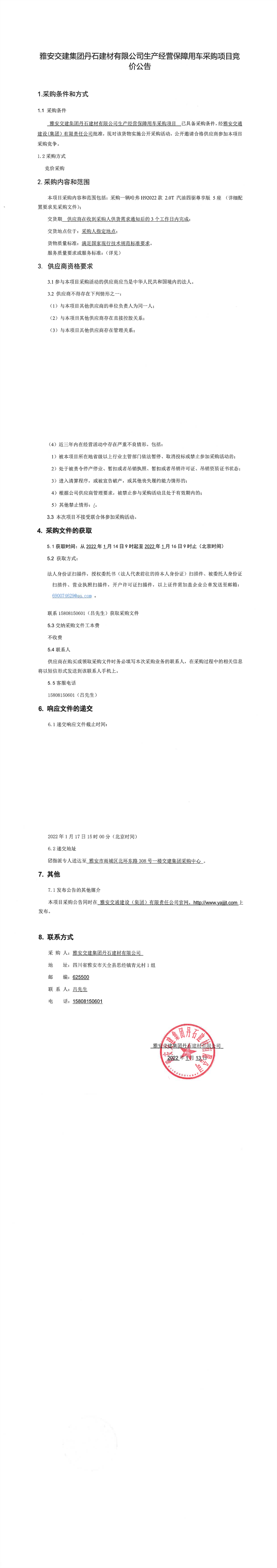 雅安交建集團丹石建材有限公司生產(chǎn)經(jīng)營保障用車采購項目競價公告