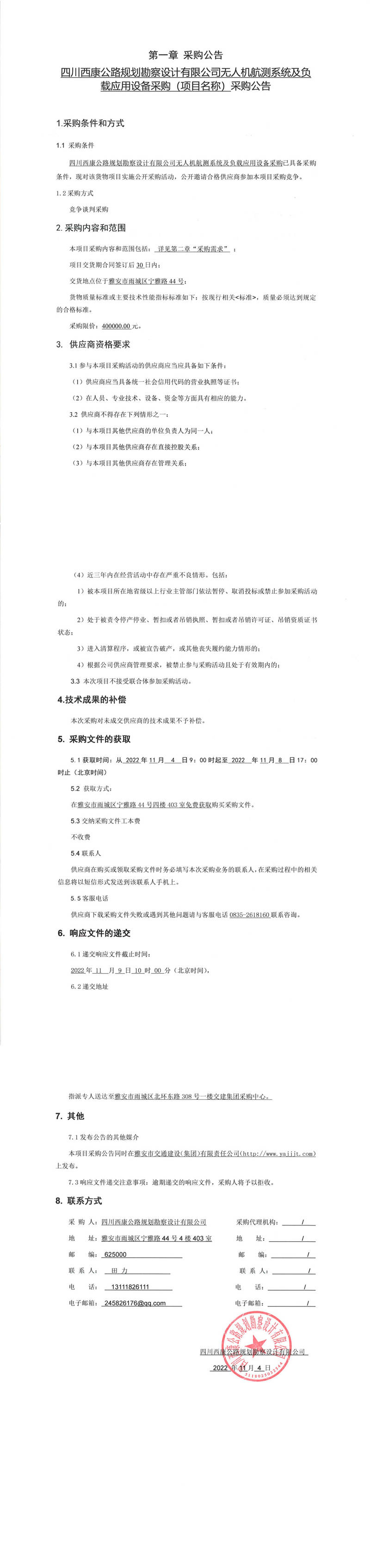 四川西康公路規(guī)劃勘察設(shè)計有限公司無人機航測系統(tǒng)及負載應(yīng)用設(shè)備采購(項目名稱)采購公告