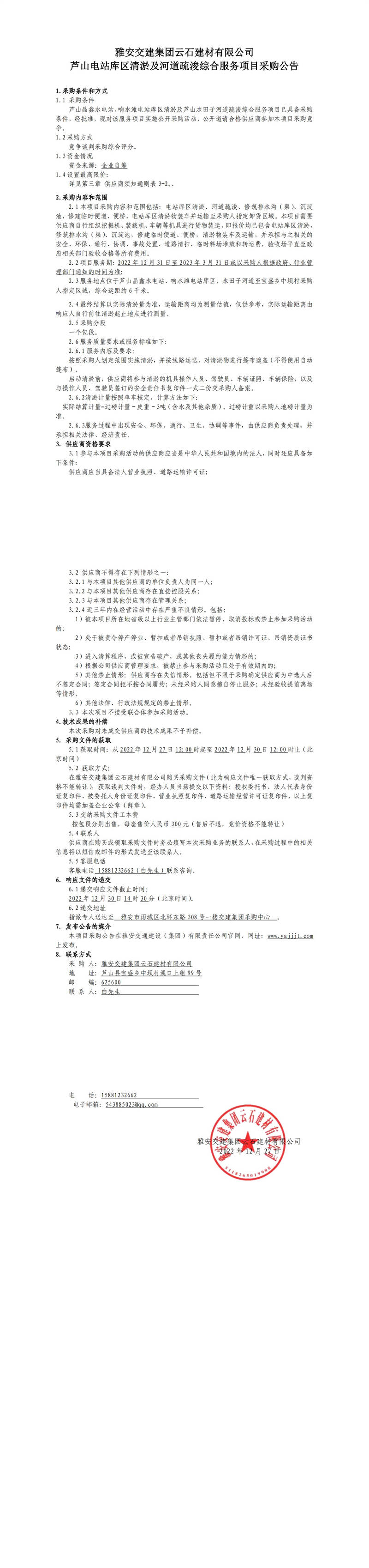 雅安交建集團云石建材有限公司蘆山電站庫區(qū)清淤及河道疏浚綜合服務(wù)項目采購公告