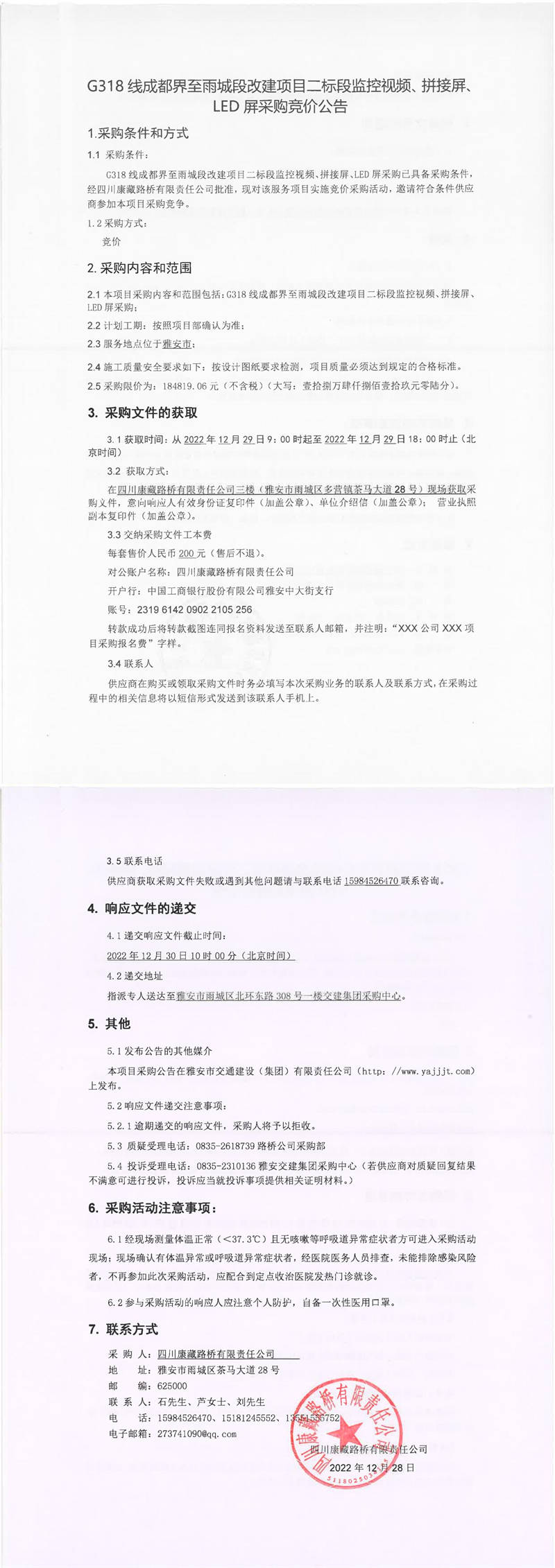 四川康藏路橋有限責(zé)任公司G318線(xiàn)成都界至雨城段改建項(xiàng)目二標(biāo)段監(jiān)控視頻、拼接屏、LED屏采購(gòu)競(jìng)價(jià)公告