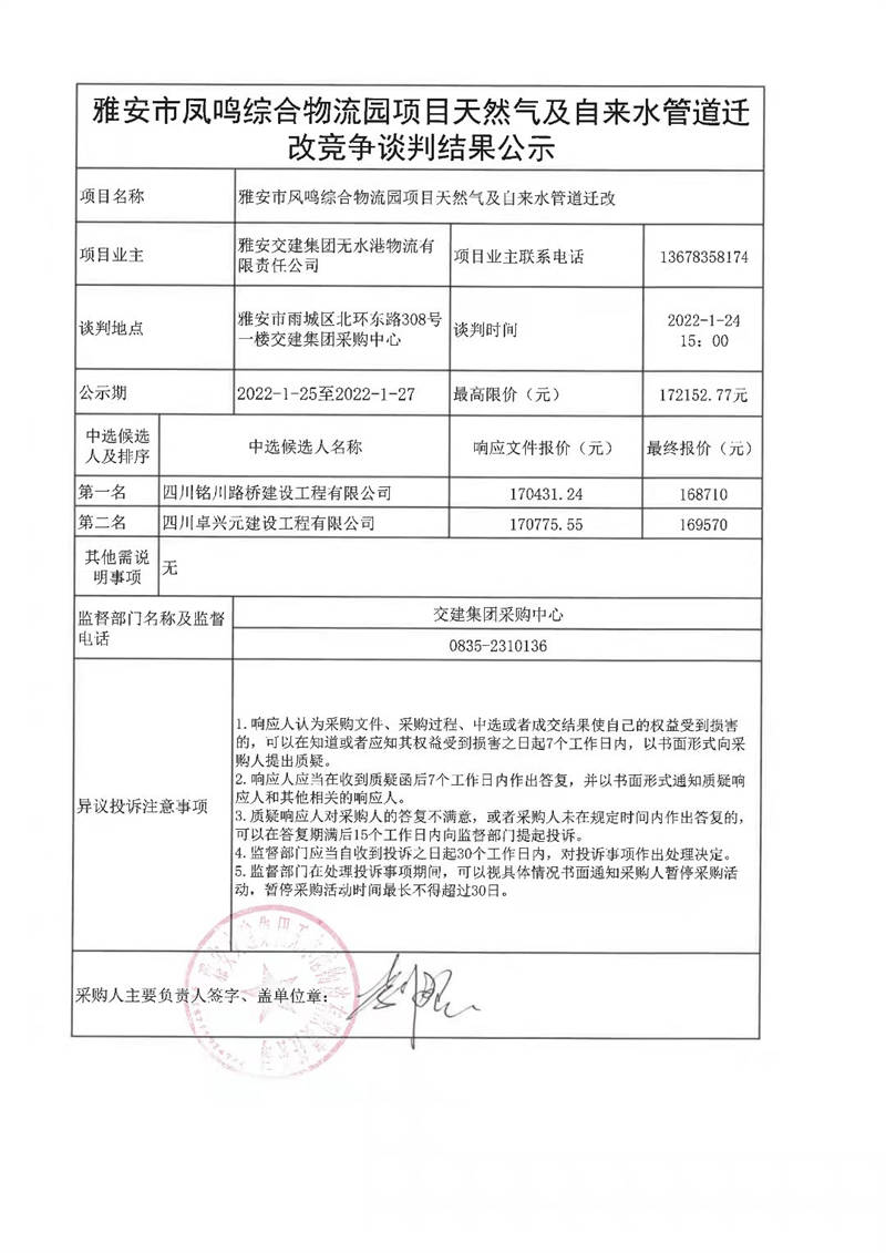 雅安交建集團無水港物流有限責任公司雅發(fā)市鳳鳴綜合物流園項目天然氣及自來水管道遷改競爭談判結(jié)果公示