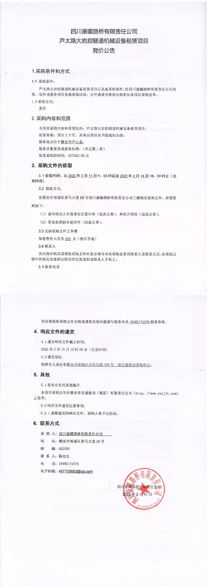 四川康藏路橋有限責(zé)任公司蘆太路大巖腔隧道機(jī)械設(shè)備租賃項(xiàng)目競(jìng)價(jià)公告