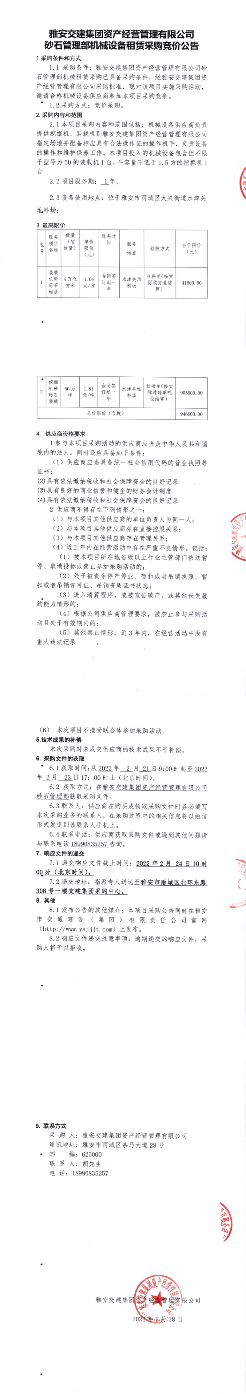 雅安交建集團(tuán)資產(chǎn)經(jīng)營管理有限公司砂石管理部機(jī)械設(shè)備租賃采購競價公告