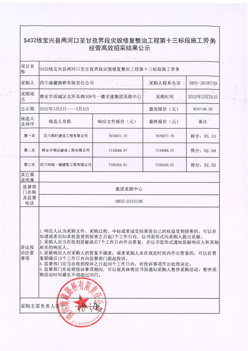 四川康藏路橋有限責任公司S432線寶興縣兩河口至甘孜界段災毀修復整治工程第十三標段施工勞務經(jīng)營高效招采結(jié)果公示