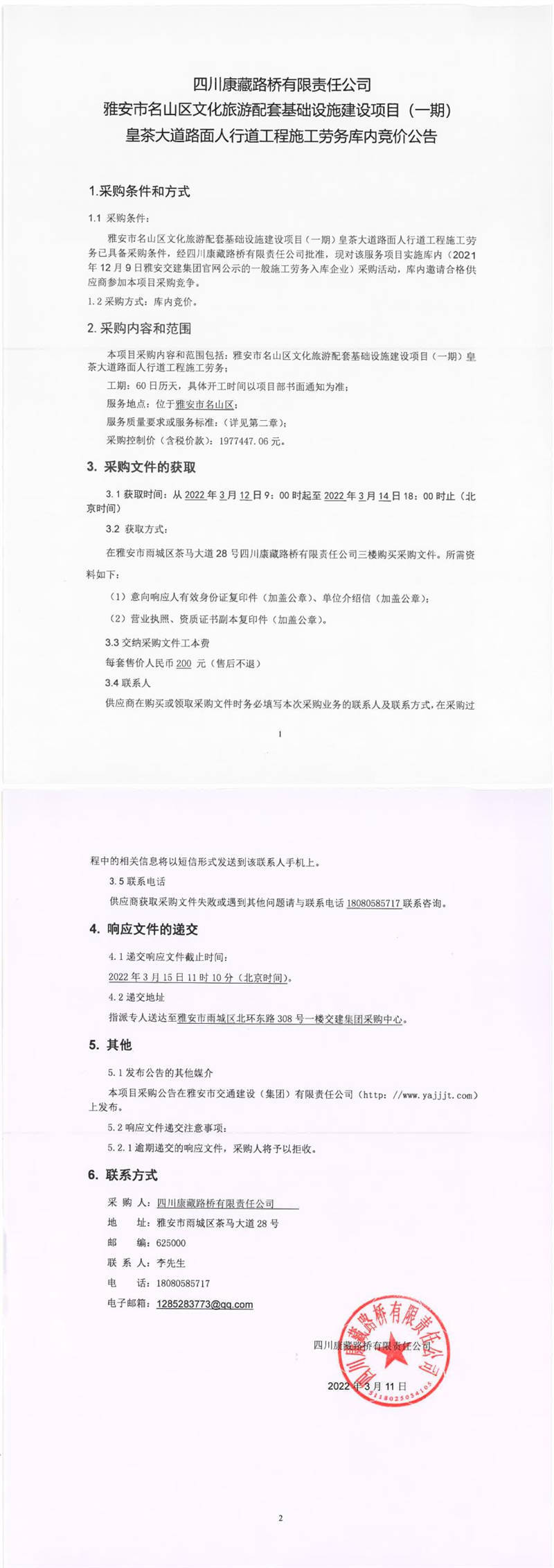 四川康藏路橋有限責(zé)任公司雅安市名山區(qū)文化旅游配套基礎(chǔ)設(shè)施建設(shè)項(xiàng)目(一期)皇茶大道路面人行道工程施工勞務(wù)庫內(nèi)競價公告