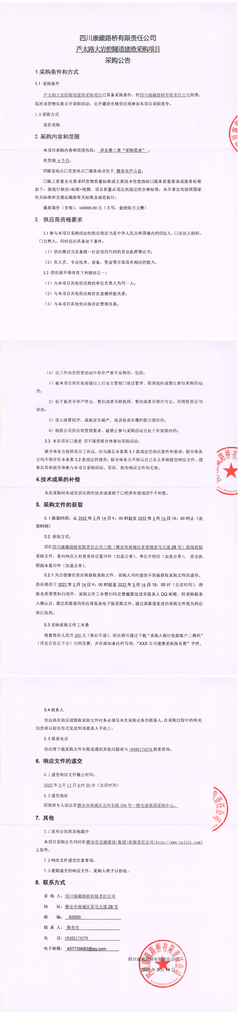 四川康藏路橋有限責(zé)任公司蘆太路大巖腔隧道建渣采購項目采購公告