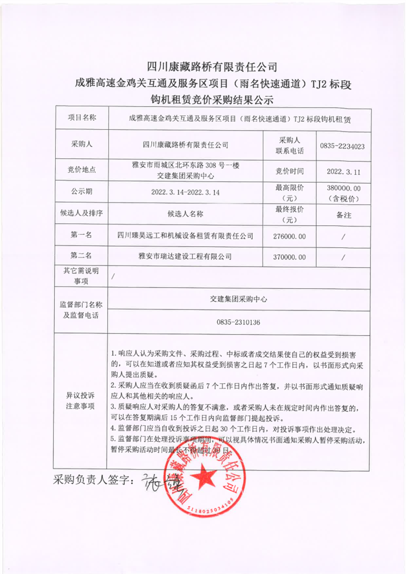四川康藏路橋有限責(zé)任公司成雅高速金雞關(guān)互通及服務(wù)區(qū)項目(雨名快速通道)TJ2標(biāo)段鉤機租賃競價采購結(jié)果公示