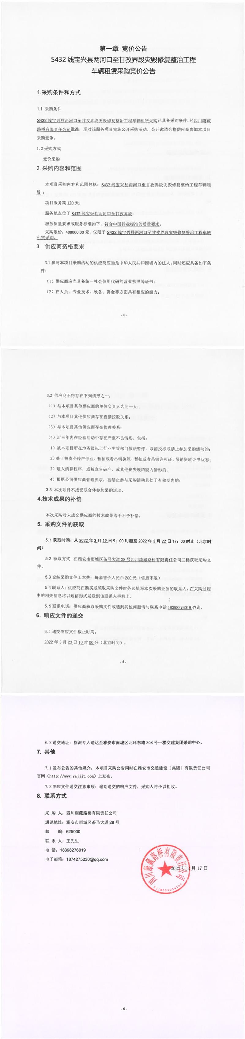 四川康藏路橋有限責(zé)任公司S432線(xiàn)寶興縣兩河口至甘孜界段災(zāi)毀修復(fù)整治工程車(chē)輛租賃采購(gòu)競(jìng)價(jià)公告