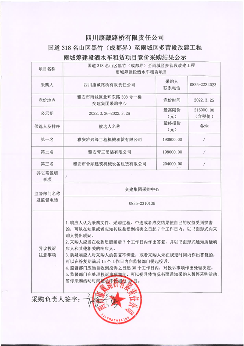 四川康藏路橋有限責(zé)任公司國道318名山區(qū)黑竹(成都界)至雨城區(qū)多營段改建工程雨城籌建段灑水車租賃項(xiàng)目競價(jià)采購結(jié)果公示