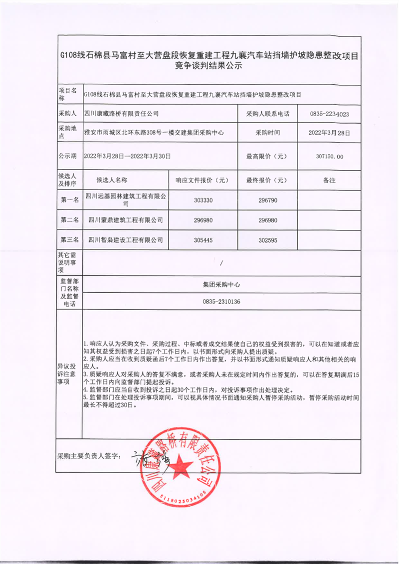 四川康藏路橋有限責任公司G108線石棉縣馬福村至大營盤段恢復(fù)重建九襄汽車站擋墻護坡隱患整改項目競爭談判結(jié)果公示