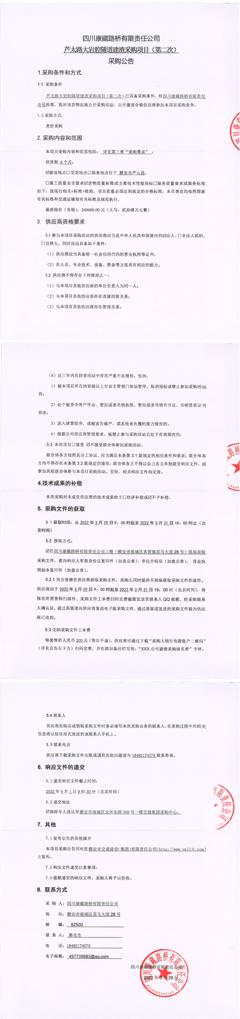 四川康藏路橋有限責(zé)任公司蘆太路大巖腔隧道建渣采購項(xiàng)目(第二次)采購公告