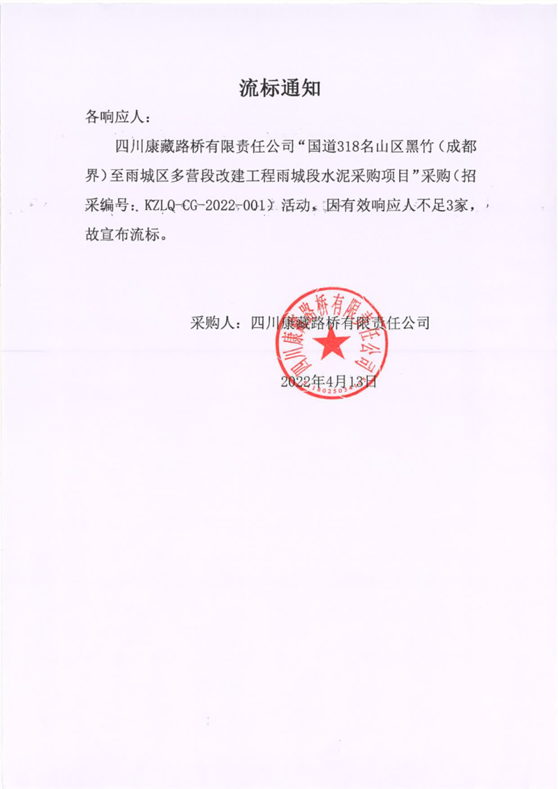 四川康藏路橋有限責(zé)任公司國道318名山區(qū)黑竹(成都界)至雨城區(qū)多營段改建工程雨城段水泥采購項目流標(biāo)通知
