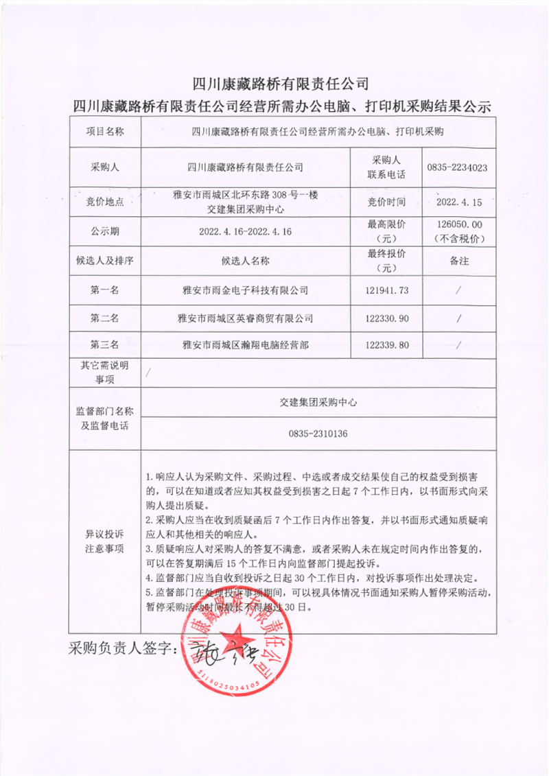 四川康藏路橋有限責(zé)任公司經(jīng)營所需辦公電腦、打印機(jī)采購結(jié)果公示