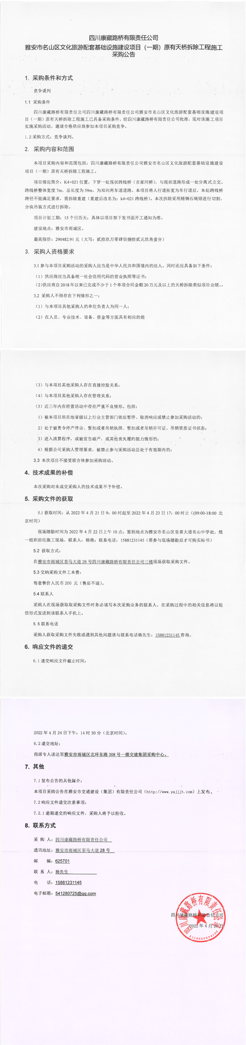 四川康藏路橋有限責任公司雅安市名山區(qū)文化旅游配套基礎(chǔ)設(shè)施建設(shè)項目(一期)原有天橋拆除工程施工采購公告