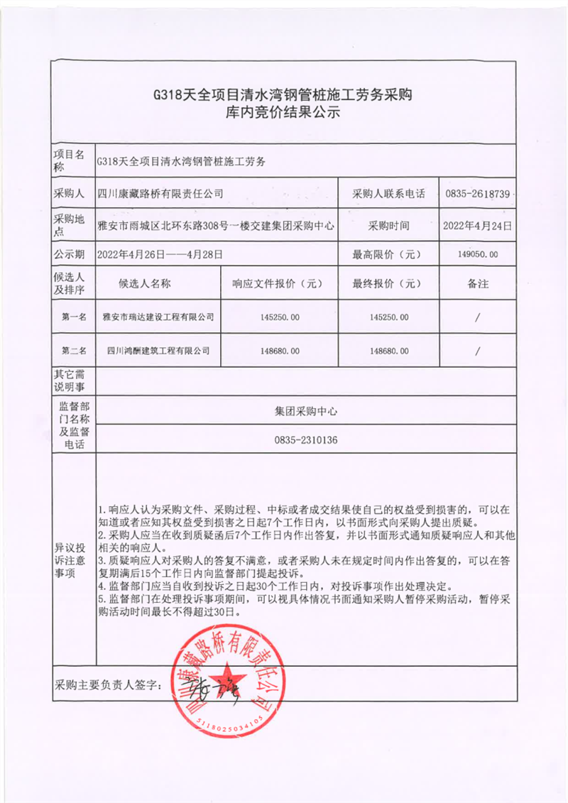 四川康藏路橋有限責任公司G318天全項目清水灣鋼管樁施工勞務采購庫內(nèi)競價結(jié)果公示