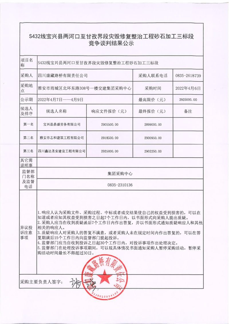 四川康藏路橋有限責(zé)任公司S432線寶興縣兩河口至甘孜界段災(zāi)毀修復(fù)整治工程砂石加工三標(biāo)段競(jìng)爭(zhēng)談判結(jié)果公示