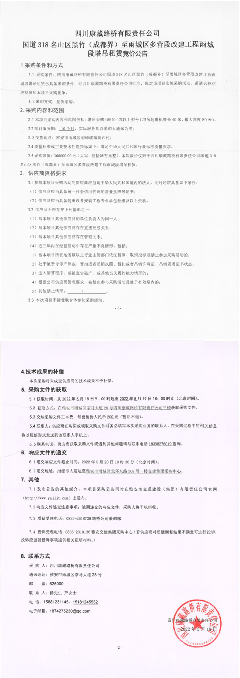 四川康藏路橋有限責(zé)任公司國道318名山區(qū)黑竹(成都界)至雨城區(qū)多營段改建工程雨城段塔吊租賃競價公告