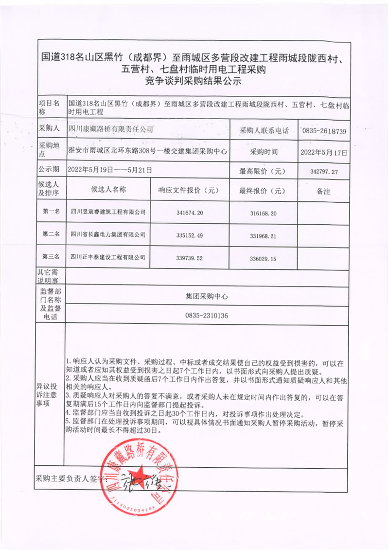 四川康藏路橋有限責任公司國道318名山區(qū)黑竹(成都界)至雨城區(qū)多營段改建工程雨城段隴西村、五營村、七盤村臨時用電工程采購競爭談判結(jié)果公示