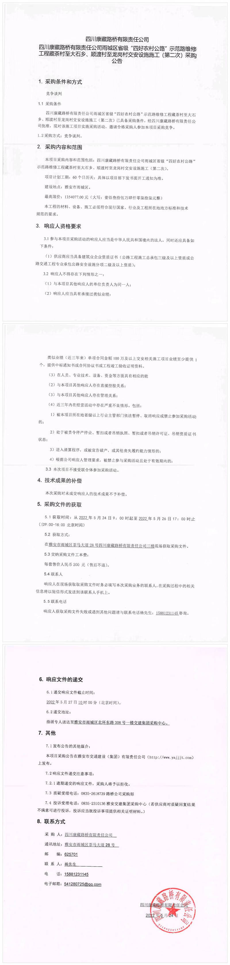 四川康藏路橋有限責(zé)任公司雨城區(qū)省級“四好農(nóng)村公路”示范路維修工程藏茶村至大石鄉(xiāng)、順渡村至龍崗村交安設(shè)施施工(第二次)采購公告