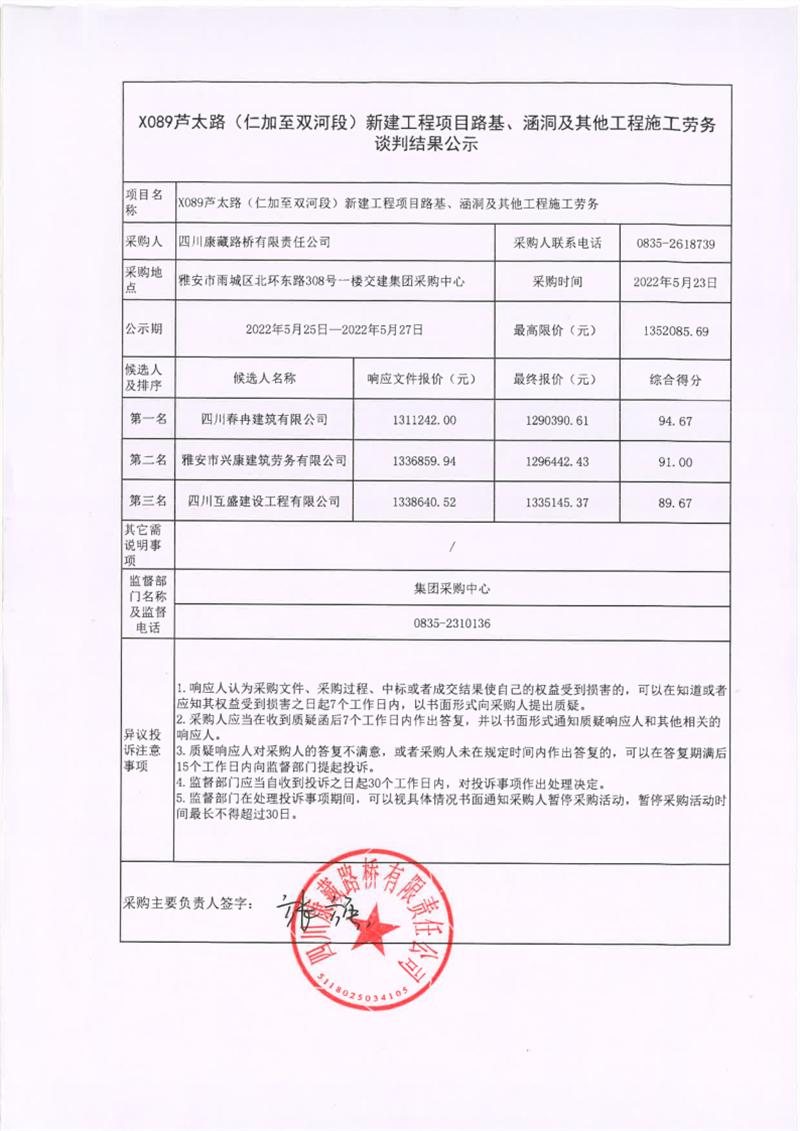 四川康藏路橋有限責(zé)任公司X089蘆太路(仁加至雙河段)新建工程項目路基、涵洞及其他工程施工勞務(wù)談判結(jié)果公示