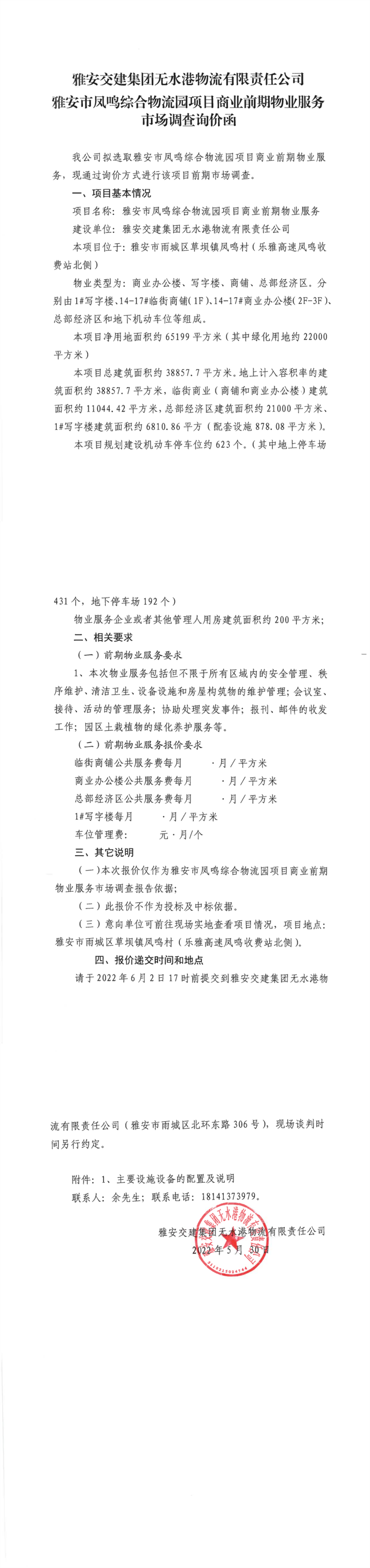 雅安交建集團(tuán)無(wú)水港物流有限責(zé)任公司雅安市鳳鳴綜合物流園項(xiàng)目商業(yè)前期物業(yè)服務(wù)市場(chǎng)調(diào)查詢價(jià)函