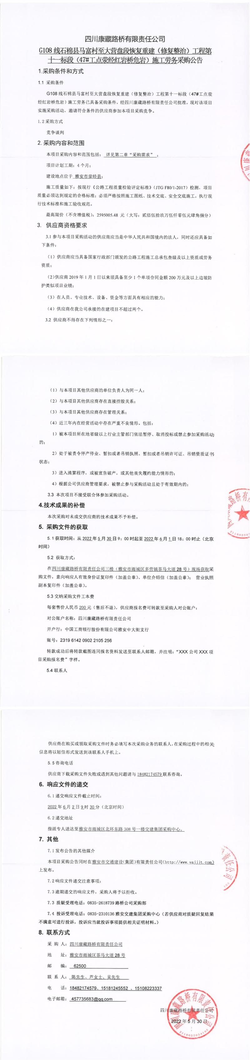 四川康藏路橋有限責(zé)任公司G108線石棉縣馬富村至大營盤段恢復(fù)重建(修復(fù)整治)工程第十一標(biāo)段(47#工點(diǎn)滎經(jīng)紅巖橋危巖)施工勞務(wù)采購公告