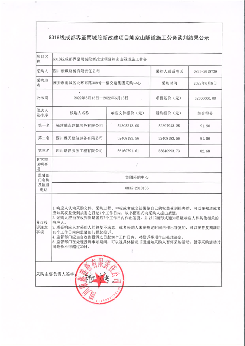 四川康藏路橋有限責任公司G318線成都界至雨城段新改建項目熊家山隧道施工勞務談判結(jié)果公示