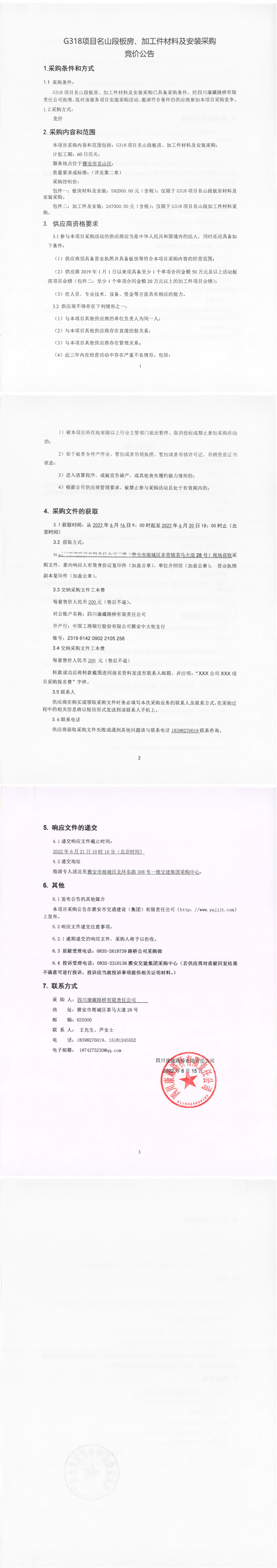四川康藏路橋有限責(zé)任公司G318項(xiàng)目名山段板房、加工件材料及安裝采購競價(jià)公告