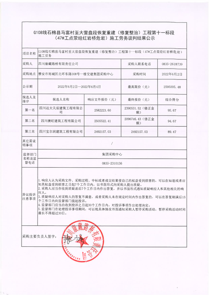 四川康藏路橋有限責(zé)任公司G108線(xiàn)石棉縣馬富村至大營(yíng)盤(pán)段恢復(fù)重建(修復(fù)整治)工程第十一標(biāo)段(47#工點(diǎn)滎經(jīng)紅巖橋危巖)施工勞務(wù)談判結(jié)果公示