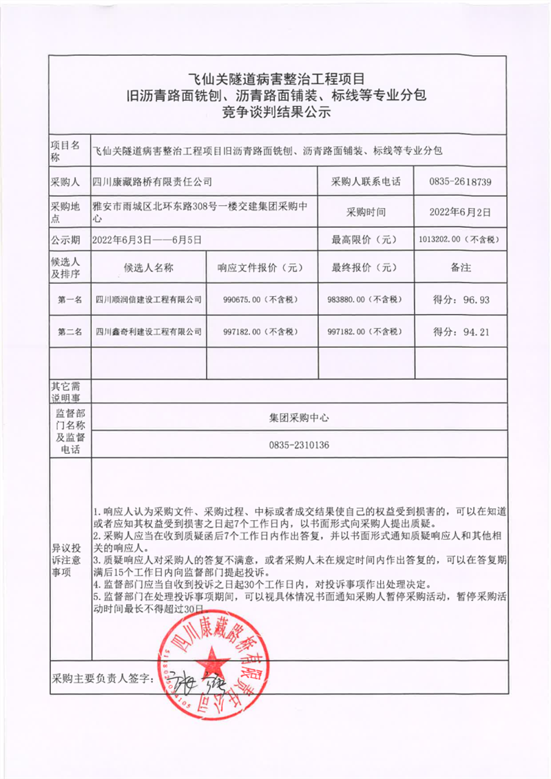 四川康藏路橋有限責(zé)任公司飛仙關(guān)隧道病害整治工程項(xiàng)目舊瀝青路面銑刨、瀝青路面鋪裝、標(biāo)線等專(zhuān)業(yè)分包競(jìng)爭(zhēng)談判結(jié)果公示