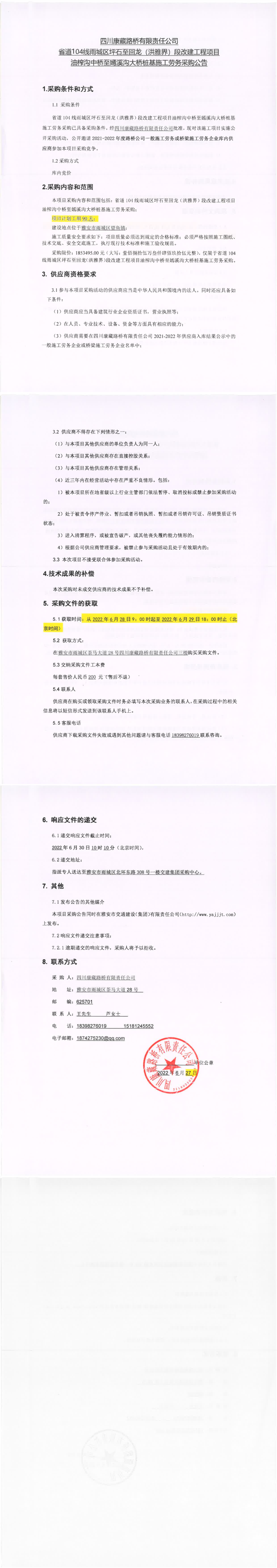 四川康藏路橋有限責(zé)任公司省道104線雨城區(qū)坪石至回龍(洪雅界)段改建工程項(xiàng)目錢壩大橋、望魚大橋樁基及鋼便橋工程施工勞務(wù)采購公告
