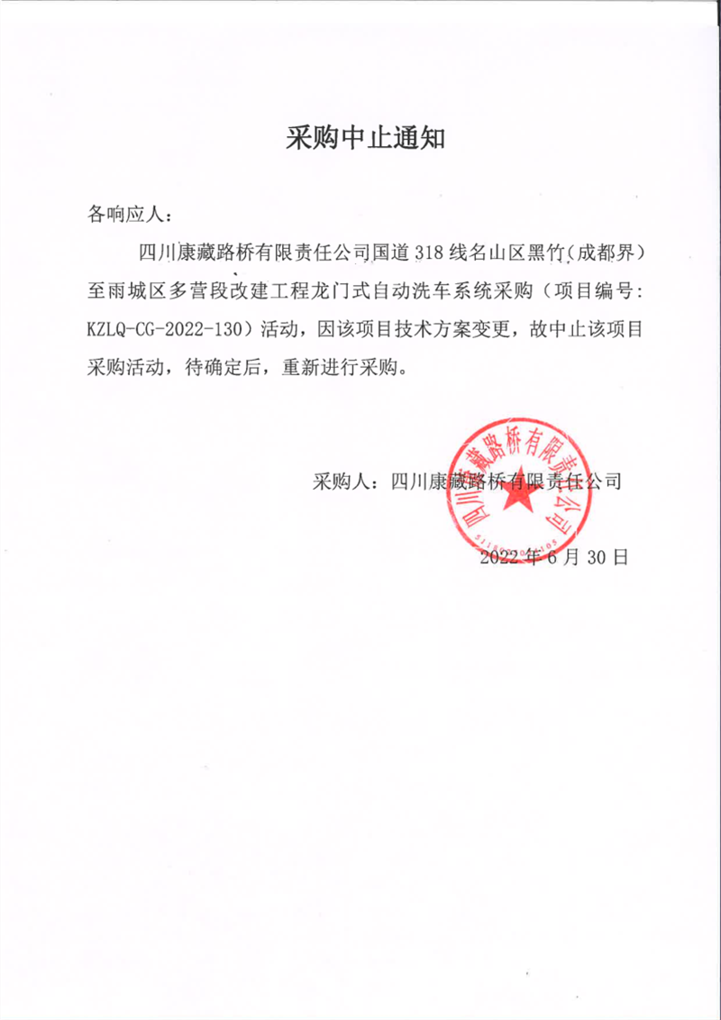 四川康藏路橋有限責(zé)任公司國(guó)道318線名山區(qū)黑竹(成都界)至雨城區(qū)多營(yíng)段改建工程龍門(mén)式自動(dòng)洗車(chē)系統(tǒng)采購(gòu)中止通知