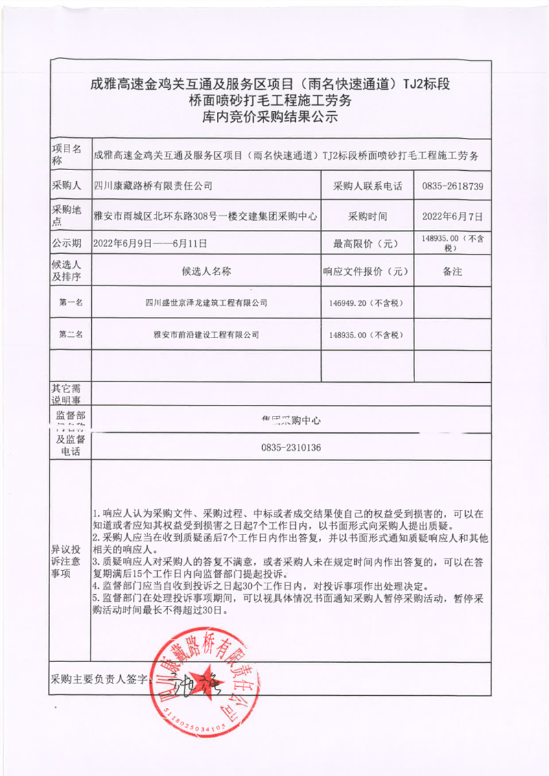 四川康藏路橋有限責(zé)任公司成雅高速金雞關(guān)互通服務(wù)區(qū)項(xiàng)目(雨名快速通道)TJ2標(biāo)段橋面噴砂打毛工程施工勞務(wù)庫內(nèi)競價(jià)采購結(jié)果公示