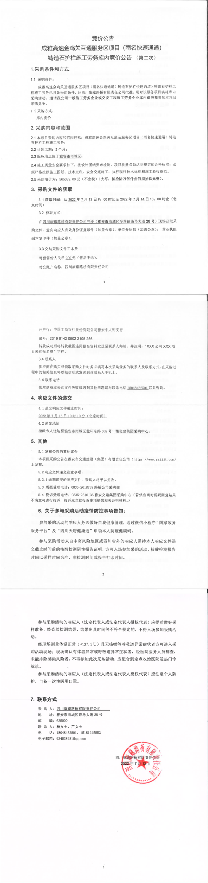 四川康藏路橋有限責(zé)任公司成雅高速金雞關(guān)互通服務(wù)區(qū)項目(雨名快速通道)鑄造石護(hù)欄施工勞務(wù)庫內(nèi)競價公告(第二次)