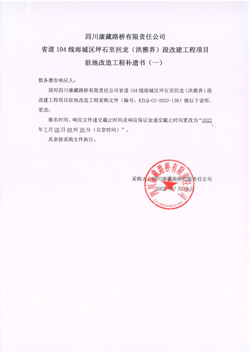 四川康藏路橋有限責任公司省道104線雨城區(qū)坪石至回龍(洪雅界)段改建工程項目駐地改造工程補遺書(一)