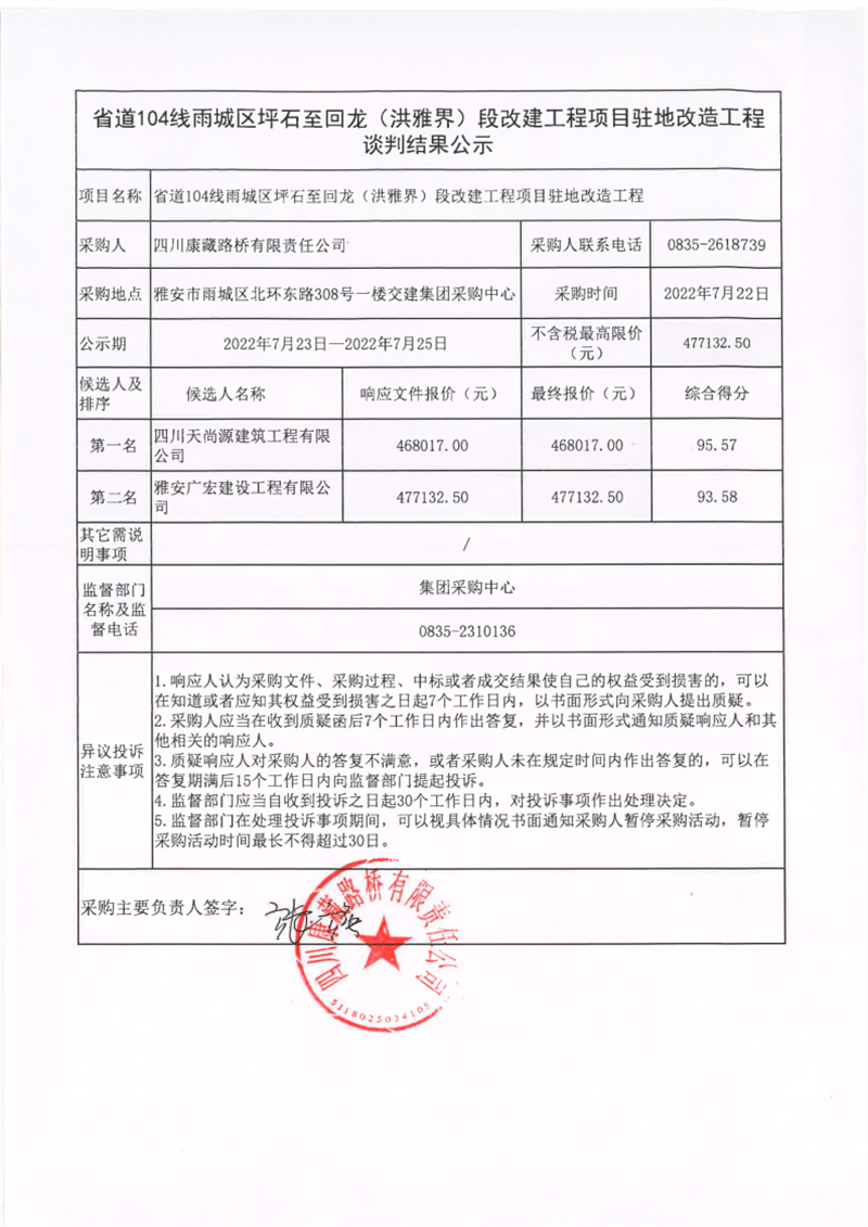 四川康藏路橋有限責任公司省道104線雨城區(qū)坪石至回龍(洪雅界)段改建工程項目駐地改造工程談判結(jié)果公示