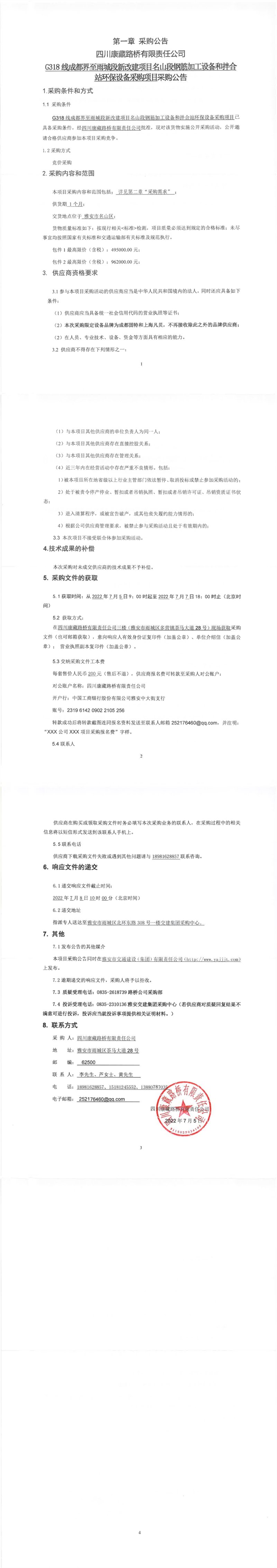 四川康藏路橋有限責(zé)任公司G318線成都界至雨城段新改建項(xiàng)目名山段鋼筋加工設(shè)備和拌合站環(huán)保設(shè)備采購(gòu)項(xiàng)目采購(gòu)公告