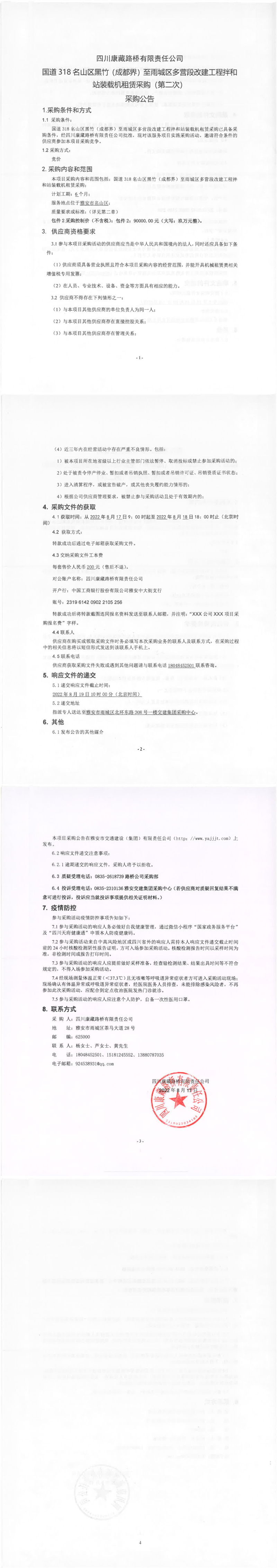 四川康藏路橋有限責(zé)任公司國道318名山區(qū)黑竹(成都界)至雨城區(qū)多營段改建工程拌和站裝載機租賃采購(第二次)采購公告