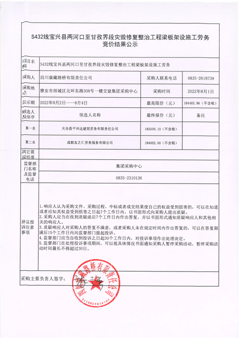 四川康藏路橋有限責任公司S432線寶興縣兩河口至甘孜界段災毀修復整治工程梁板架設(shè)施工勞務競價結(jié)果公示