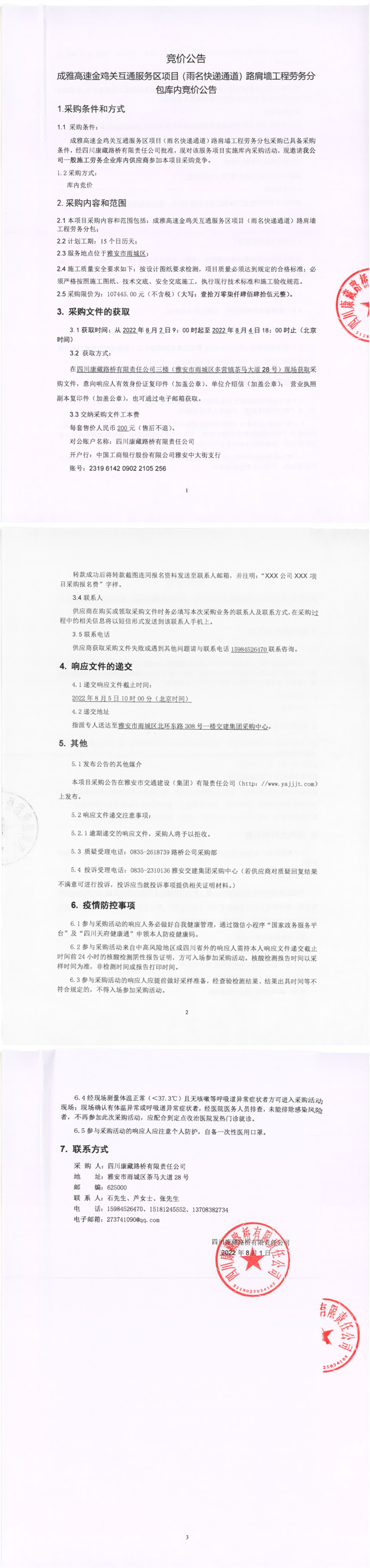 四川康藏路橋有限責(zé)任公司成雅高速金雞關(guān)互通服務(wù)區(qū)項(xiàng)目(雨名快速通道)路肩墻工程勞務(wù)分包庫內(nèi)競(jìng)價(jià)公告