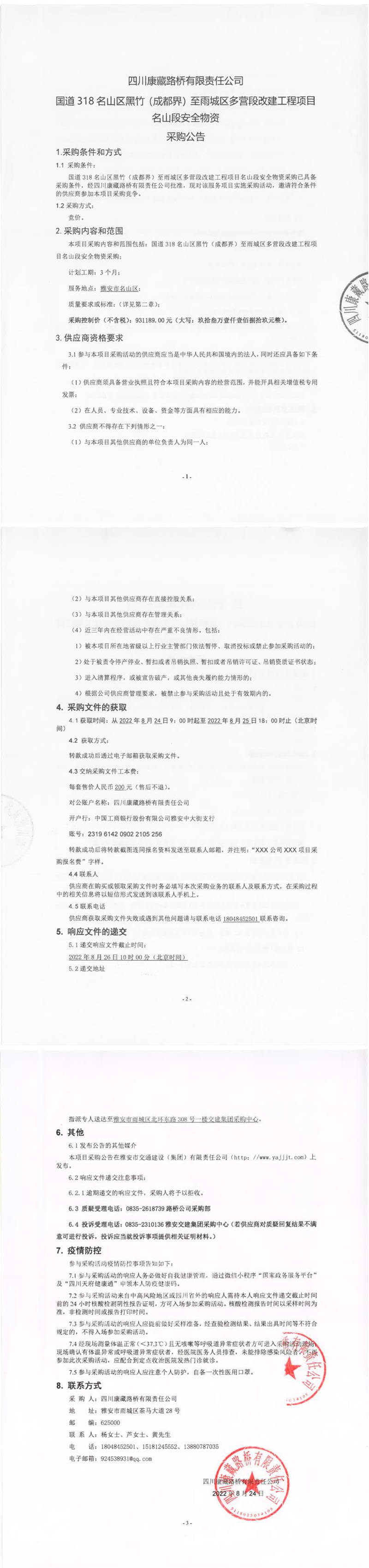 四川康藏路橋有限責任公司國道318名山區(qū)黑竹(成都界)至雨城區(qū)多營段改建工程項目名山段安全物資采購公告