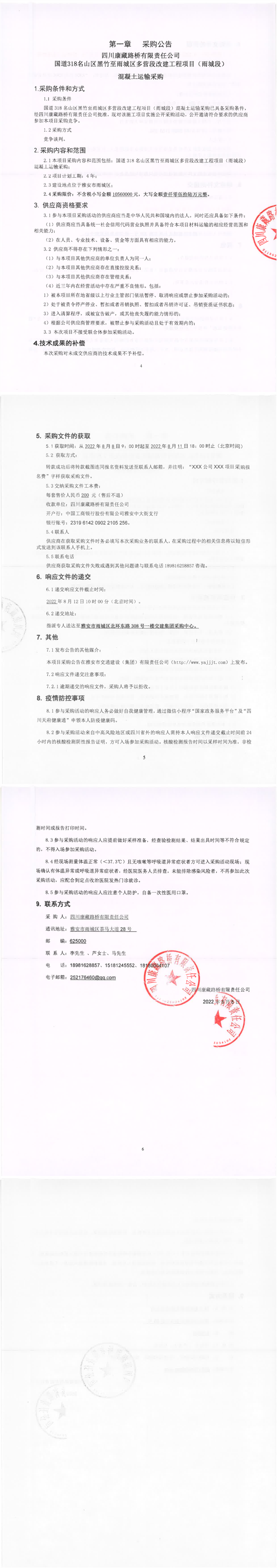 四川康藏路橋有限責任公司國道318名山區(qū)黑竹至雨城區(qū)多營段改建工程項目(雨城段)混凝土運輸采購公告