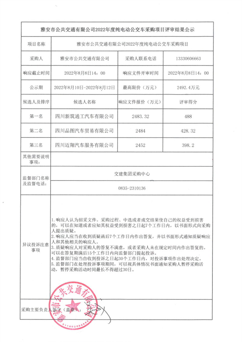 雅安市公共交通有限公司2022年度純電動公交車采購項(xiàng)目評審結(jié)果公示