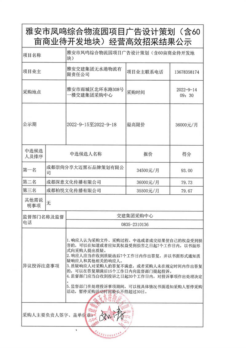 雅安交建集團(tuán)無(wú)水港物流有限責(zé)任公司雅安市鳳鳴綜合物流園項(xiàng)目廣告設(shè)計(jì)策劃(含60畝商業(yè)待開(kāi)發(fā)地塊)經(jīng)營(yíng)高效招采結(jié)果公示